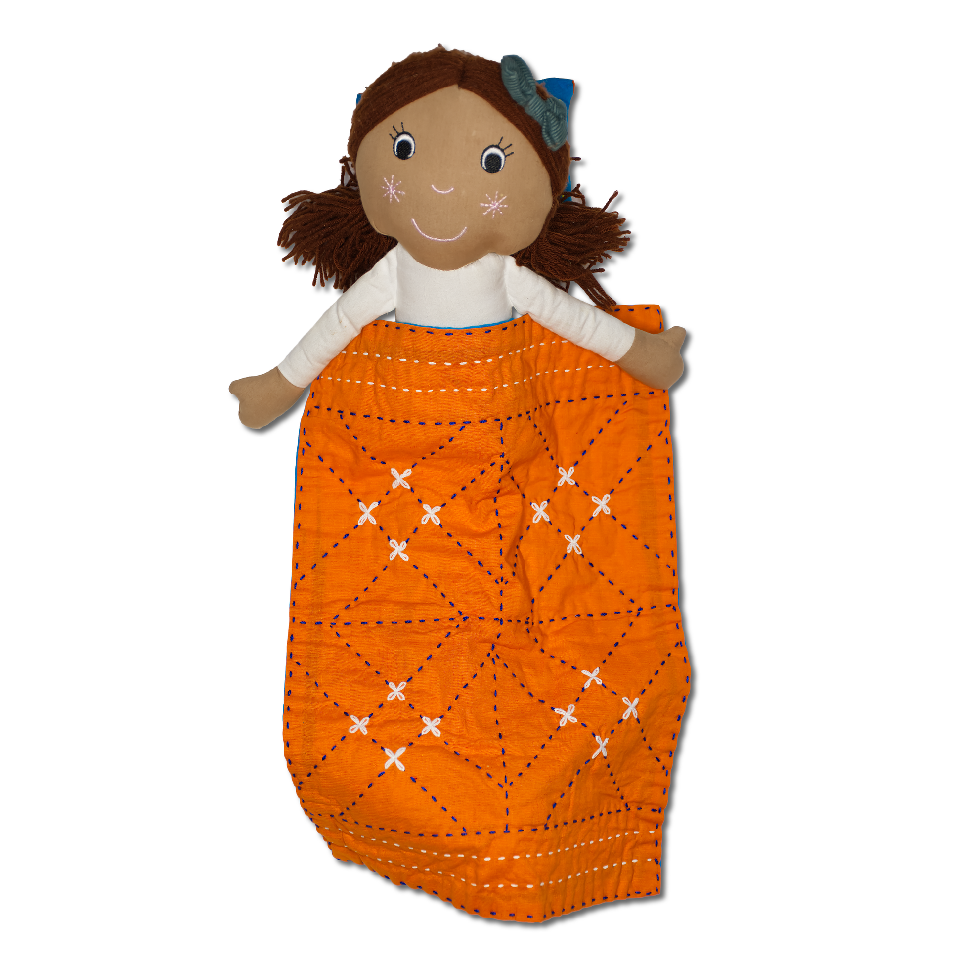 The doll bedding set comes presented in a re-usable cotton drawstring bag, hand-crafted from a vintage sari offcut, with a packaging insert sharing the story of our social enterprise mission.