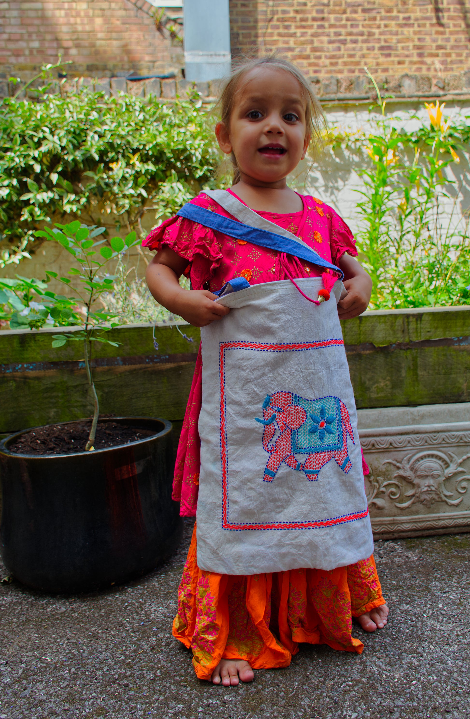 The tote bag comes presented in a re-usable cotton drawstring bag, hand-crafted from a vintage sari offcut, with a packaging insert explaining Khushi Kantha’s social enterprise mission and story – so it works perfectly as a gift!
