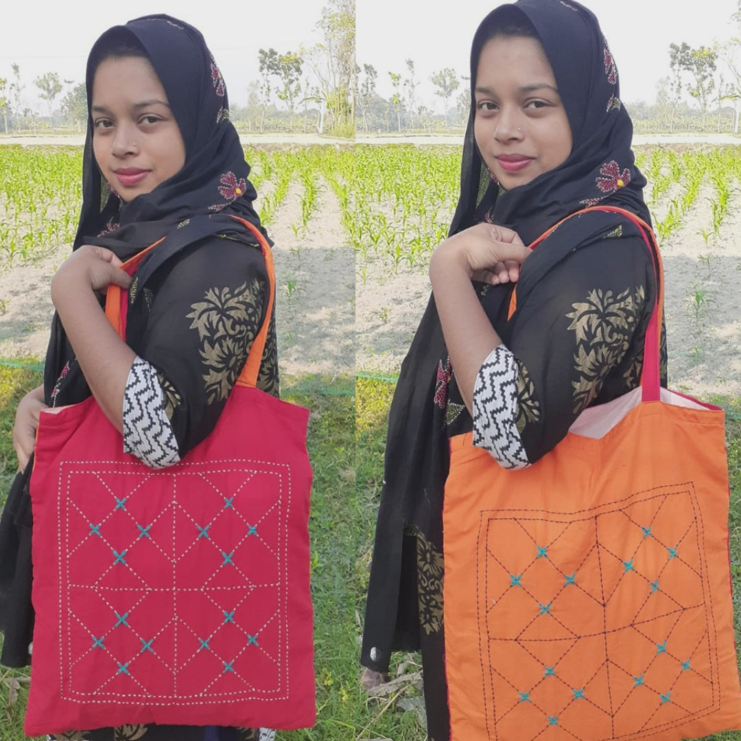 Reversible tote bag, handmade from 100% cotton handloom fabric, hand-dyed using Oeko-Tex Passport-certified dyes, lined with upcycled ‘deadstock’ cotton fabric from the Bangladeshi garments industry, and embroidered with empowerment by a mother in Bangladesh.
