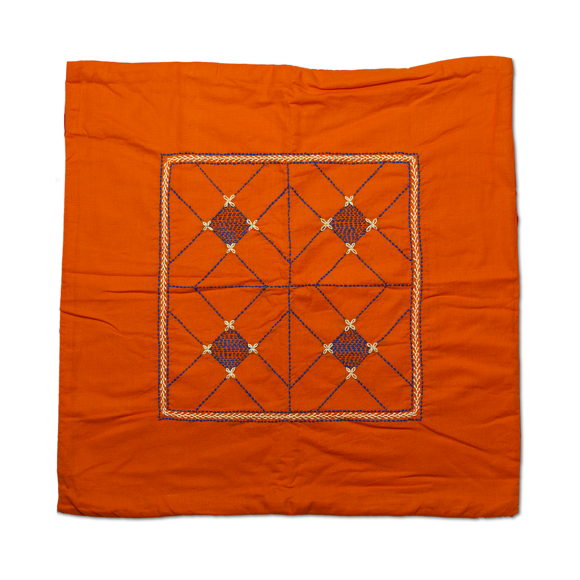 Cushion cover, handmade from 100% cotton handloom fabric, hand-dyed using Oeko-Tex Passport-certified dyes, and lined with upcycled deadstock 100% cotton fabric from the Bangladeshi garments industry.